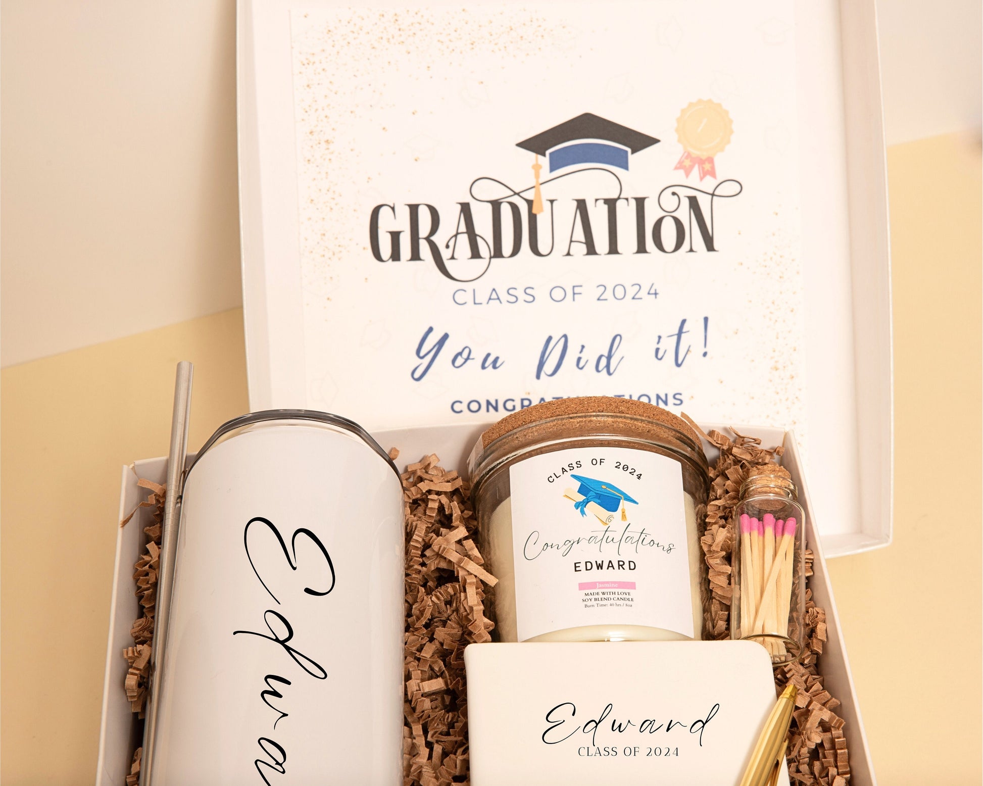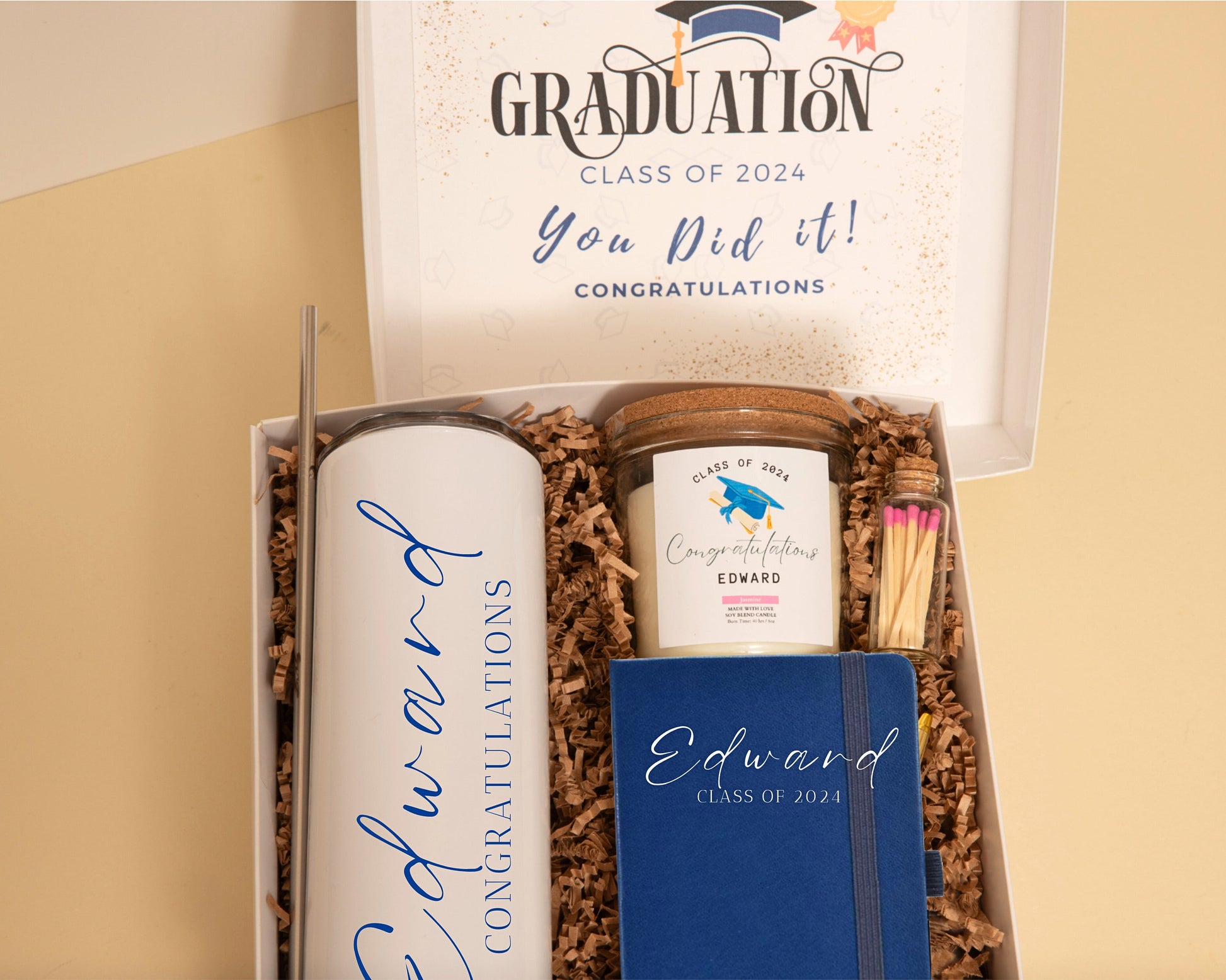 Celebrate the Class of 2025 with our Graduation Gift Box for Him! This College Graduation Gift Box is the perfect Personalized Grad Gift featuring a Custom Name Tumbler, a Writing Journal with Pen, and a Congratulation Gift that includes a special candle with a personalized name, matches in a glass tube, and a custom greeting card. Make his graduation day memorable with this thoughtful gift. Perfect for commemorating his achievement and starting the next chapter of his journey. This congratulation gift is ideal for sons, brothers, boyfriends, or any college graduate. With personalized graduation gifts for him, including our custom name tumbler and writing journal, this gift box is both practical and memorable. Don't miss out on this great graduation gift for him, Class of 2025!