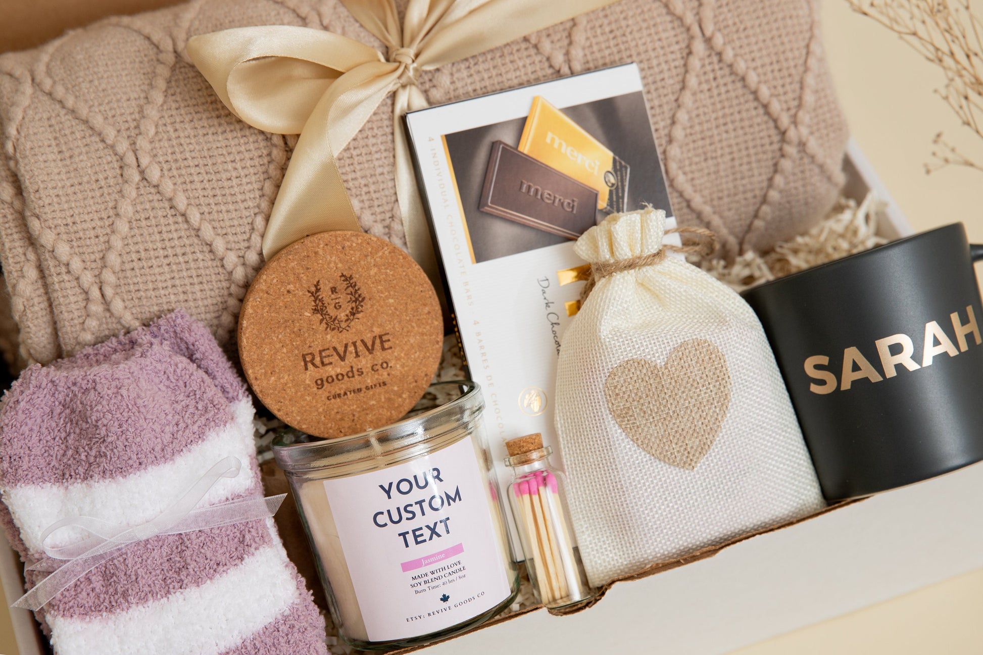 Every Revive Goods Co. gift box is made to order, carefully packed in our deluxe gift box/basket with spring fill and wrapped with double-sided satin ribbon and our signature tag.